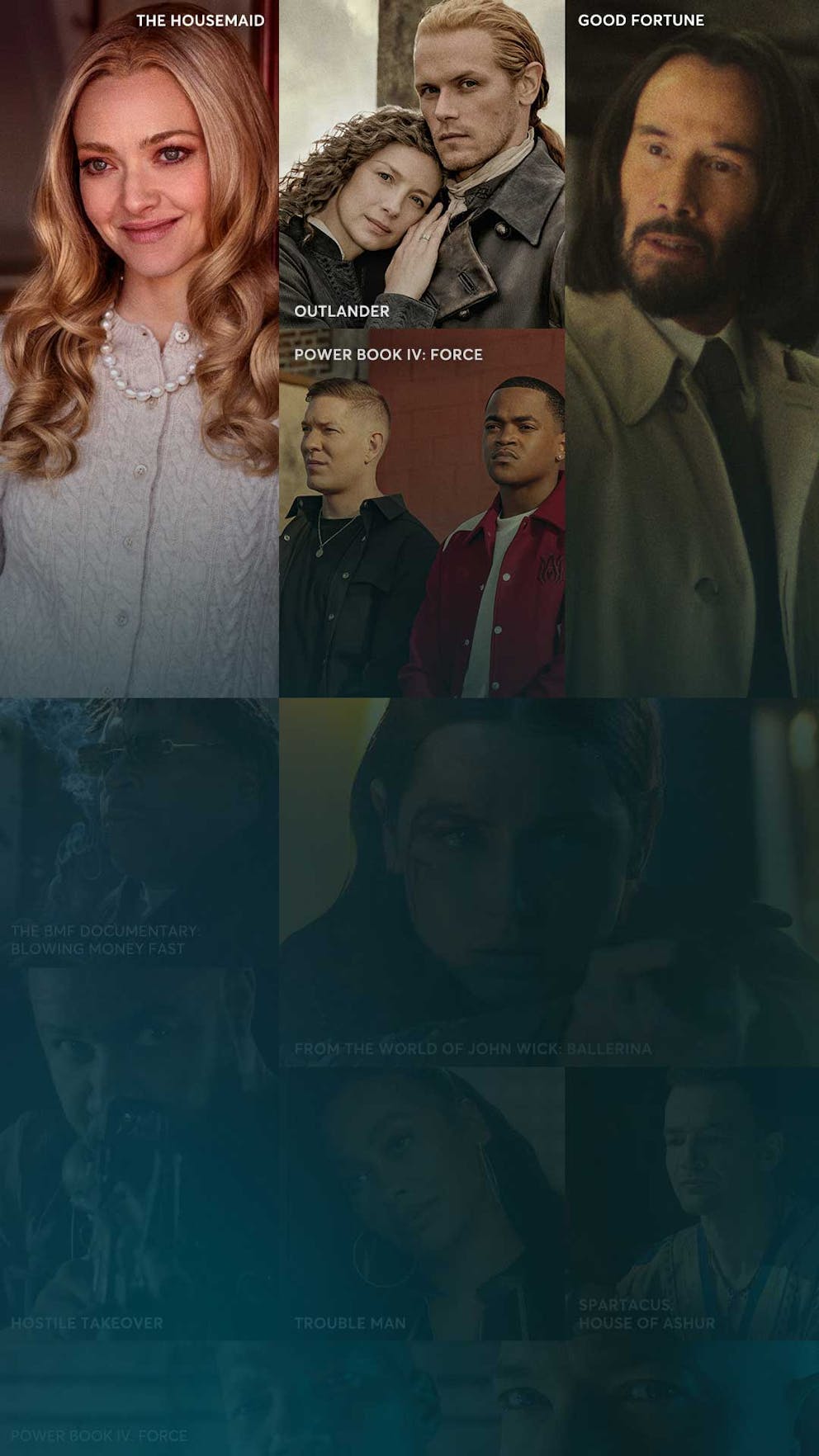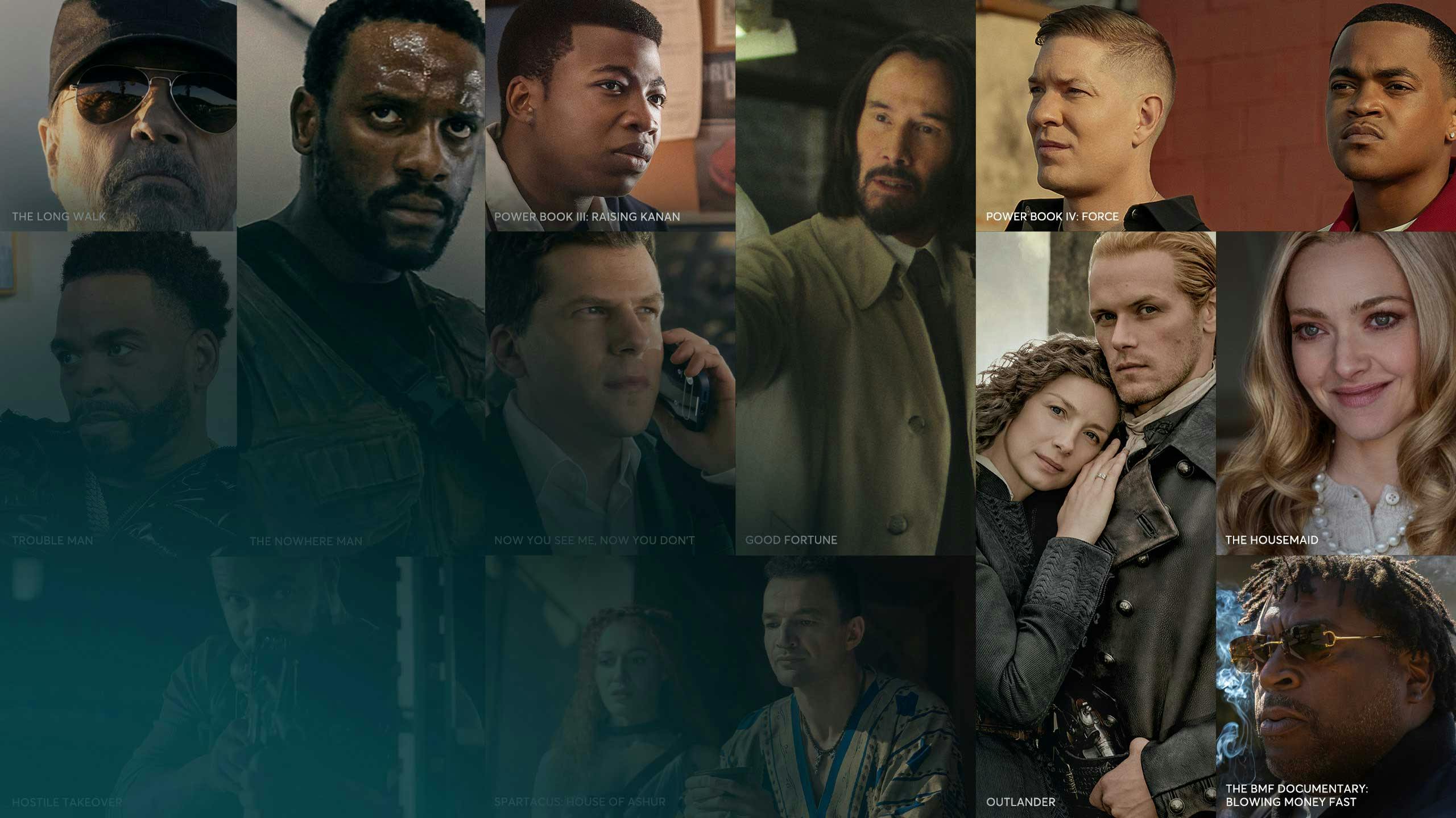 Collage of STARZ content posters including The Nowhere Man, The Long Walk, Power Book IV: Force, Good Fortune, BMF: Blowing Money Fast and Trouble Man